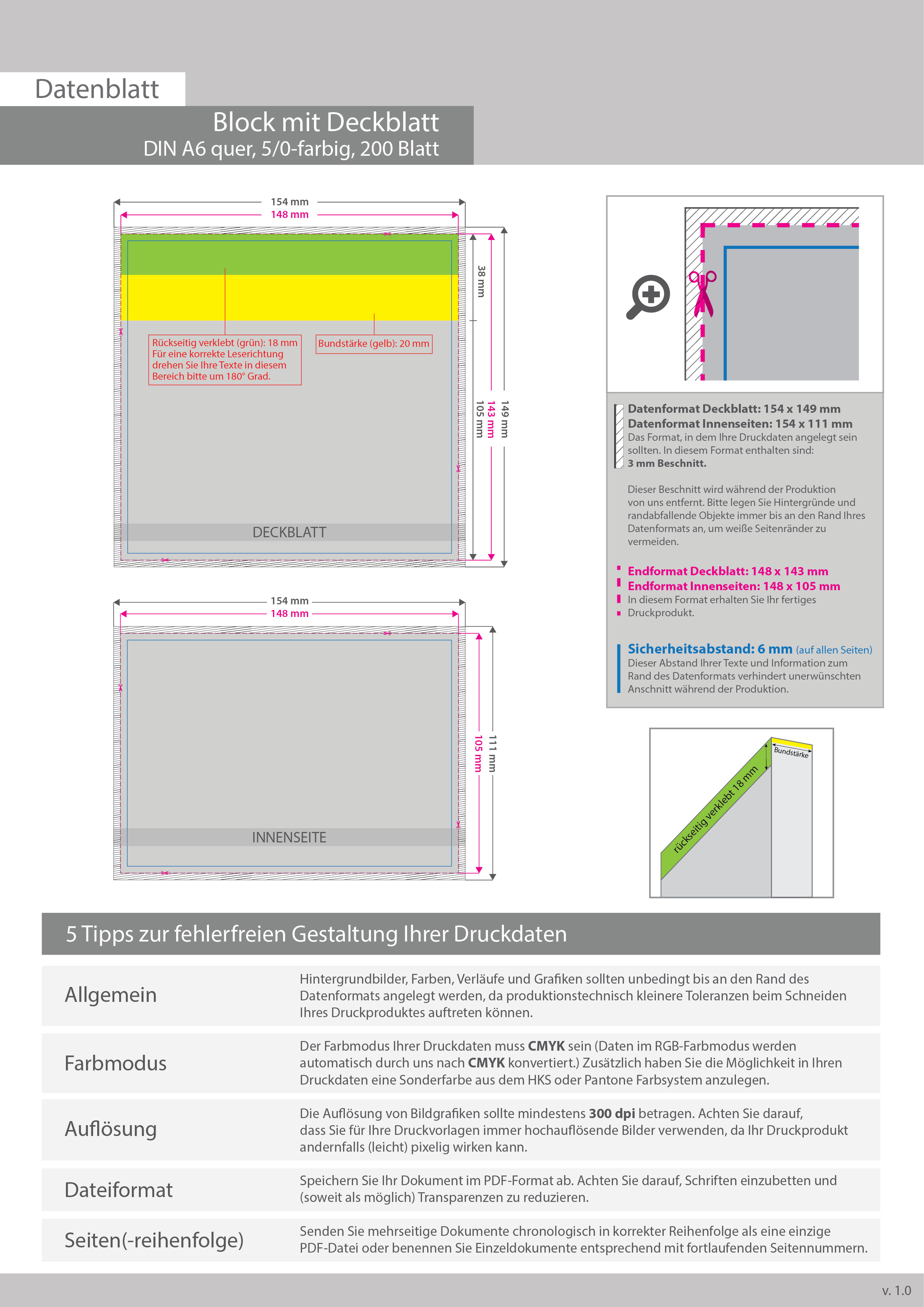 Block mit Leimbindung und Deckblatt, DIN A6 quer, 200 Blatt, 5/0 farbig einseitig bedruckt (CMYK 4-farbig + 1 Sonderfarbe HKS oder Pantone)